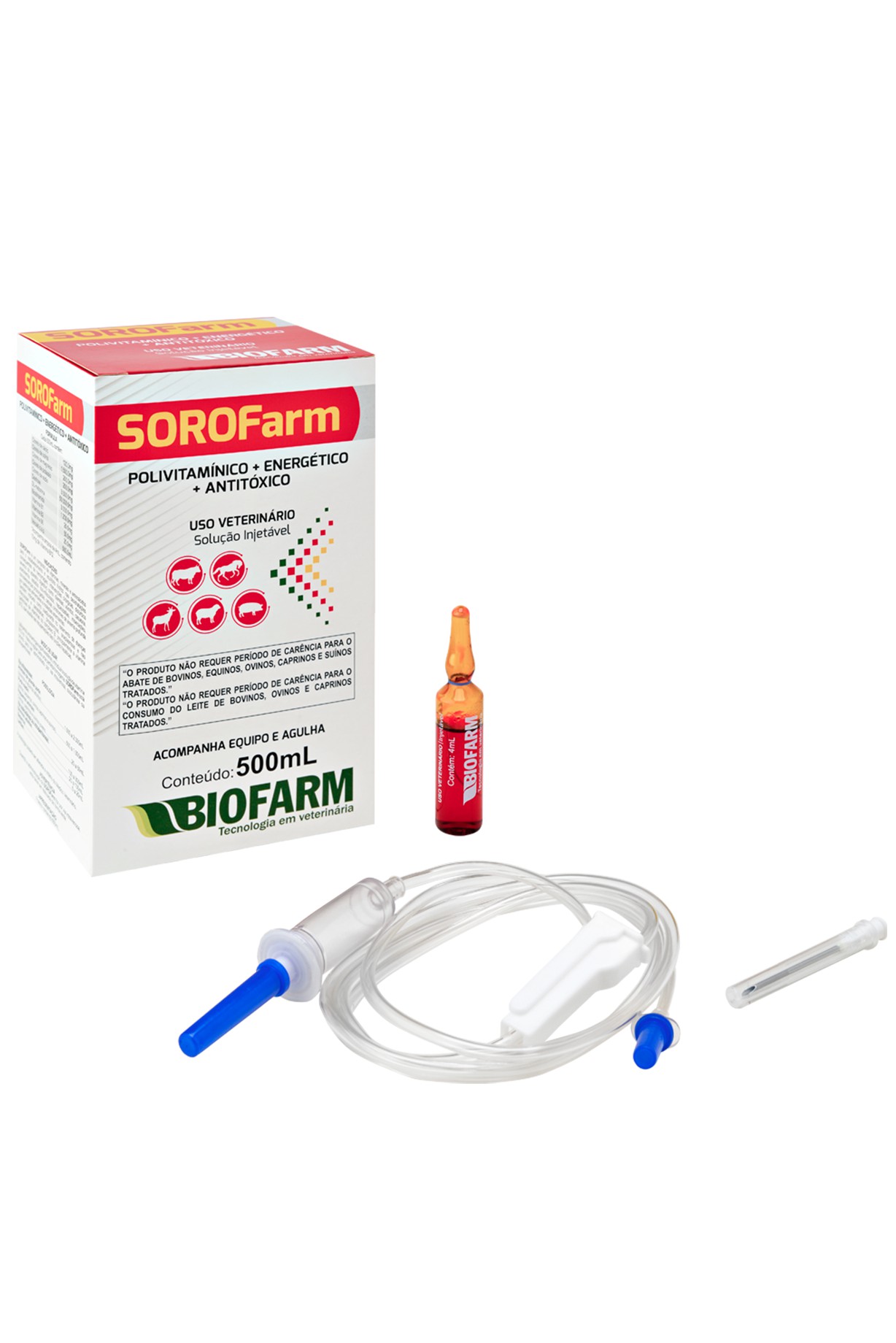 SOROFarm é um composto de vitaminas, minerais e aminoácidos para o restabelecimento e o equilíbrio hídrico nas desidratações consequentes de hemorragias, intervenções cirúrgicas, distúrbios severos do aparelho digestivo (como diarreias e vômitos), caquexias, acetonemia, estados toxi-infecciosos, hepatopatias, intoxicações, convalescenças prolongadas, cetose, síndromes de anemia profunda por carências alimentares e moléstias anemiantes. Também indicado como coadjuvante nos tratamentos de doenças infecciosas, parasitárias e nas carências de vitaminas do complexo B.